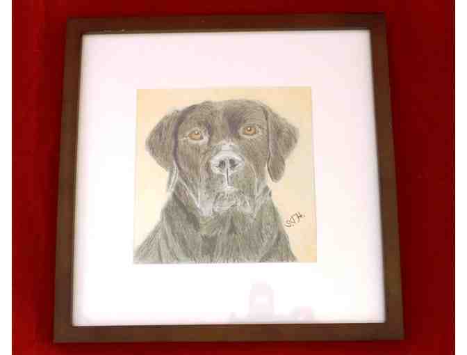 This pencil sketch shows Skiba, a black Labrador retriever, adoringly looking at you with his brown eyes. The drawing was inspired by a photograph of the recently retired Seeing Eye breeder. The 7" x 7" drawing is matted to fit in a 12" x 12" dark brown frame.