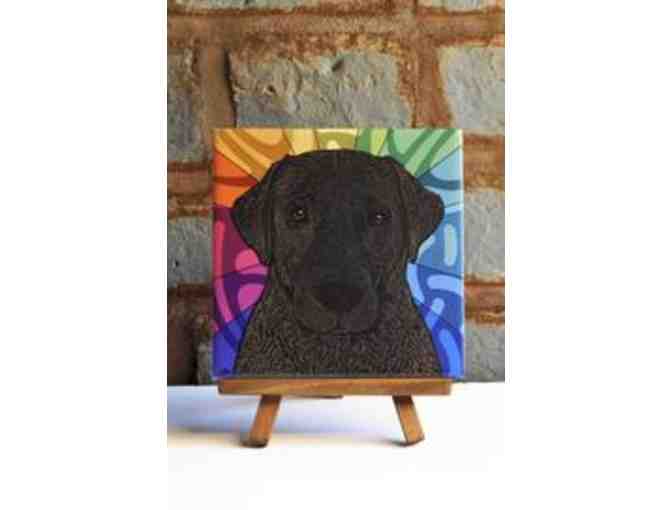 Sabyloo PupArt Socks presents a pair of cotton/spandex/nylon black socks (sz 9-11) with chocolate lab in green print near the top, a drawing of a chocolate lab in gold on green, and green paw prints on the feet.  This gift also comes with a ceramic tile for use as a coaster or for hot dishes of the chocolate lab on rainbow colored background, and a 5x7 print of the chocolate lab against a city background in blue and black, double matted to size 8x10 and ready for framing.