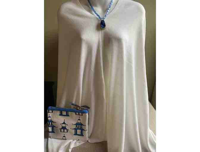 Beautiful blue Druzy necklace, ivory poncho, and Pagoda comestic case.
