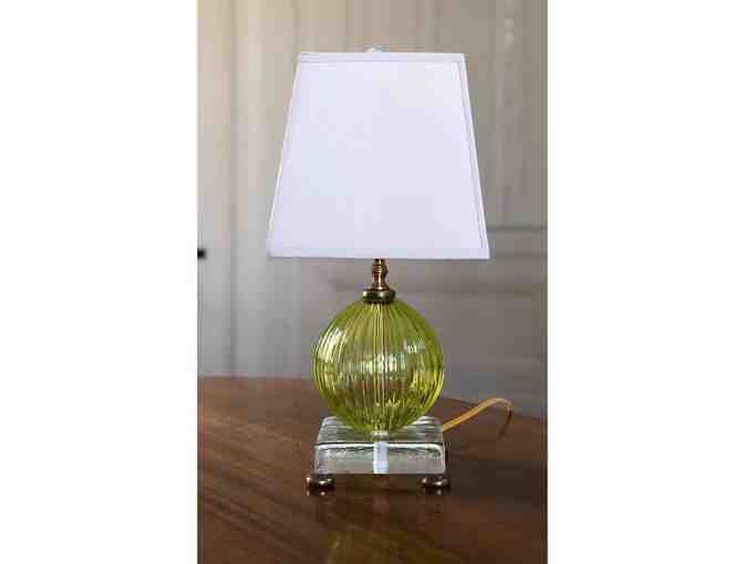 Chartreuse Paris Lamp with silk shade. Hand blown and hand cast glass with solid brass detail and silk shade.