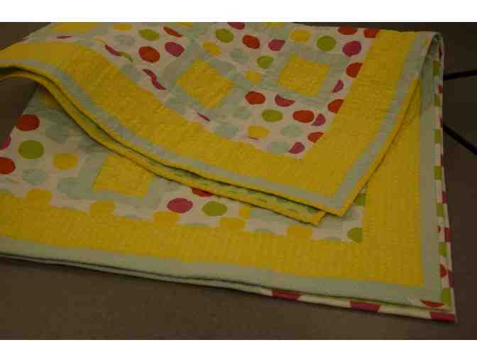 This colorful, splashy, cheerful quilt would be a nice addition to a baby's room or a child's bedroom.  Each 5" x 5" inch panel within the quilt alternates with red/pink/green/yellow/aqua polka dot on white and yellow geometric pattern bordered by aqua blue. The entire quilt is finished off with borders of all three fabrics graduating to the hems.  The flip side is one fabric of medium green polka dots on a lighter green background.  This hand-crafted quilt is expertly finished off on all four sides.