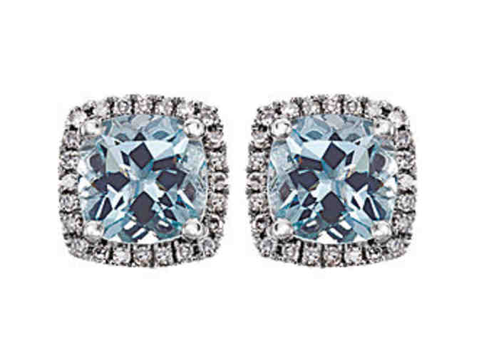 These beautiful 6mm Cushion Cut Genuine Aquamarines are surrounded by .13 carats of Brilliant Round diamonds set in 14K White Gold