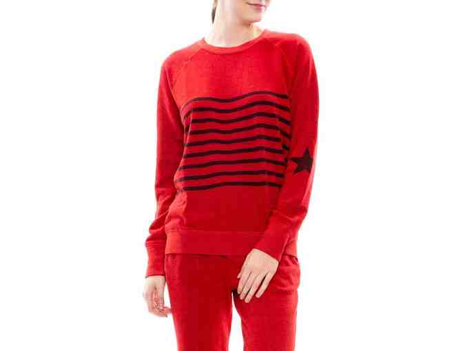 BASIC SWEATSHIRT BODY CUT IN A HEAVY TERRY FABRICATION. FEATURING PRINTED STIPES AND STAR. RAGLAN SLEEVES. CONTRAST TRIM.