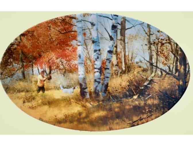 Brett Simon depicts a flurry of wings of the elusive ruffed Grouse on a colorful fall day. Maple leaf textured design is included on the back rim along with Brett Smith's signature plaque.