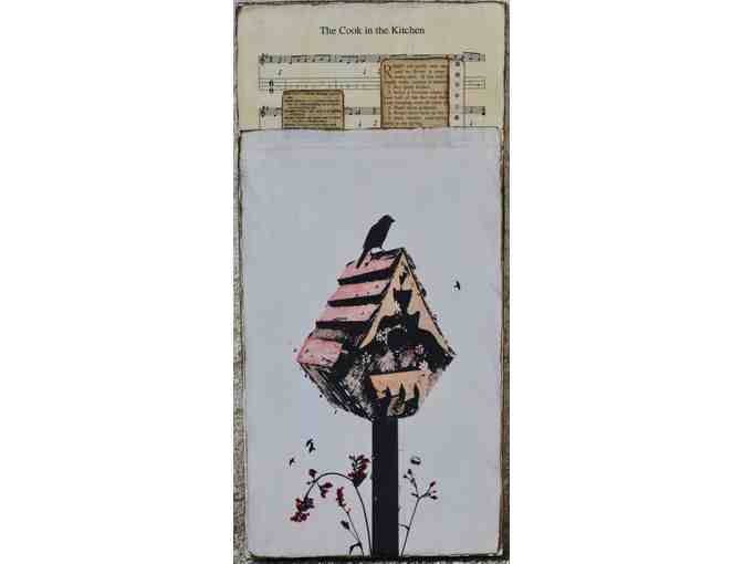 The ART: "The Cook in the Kitchen" is a 8"x16" photo collage on wood. The image is an original photograph taken by Patrick, then printed and layered over recycled book pages and sheet music. The images are hand painted and the art is then covered with a gel medium for protection. Signed by Patrick