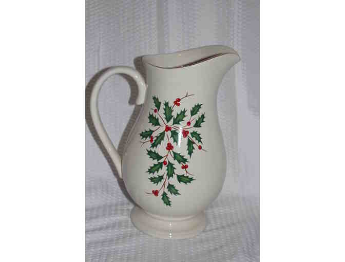 Lenox Holiday Holly pitcher, stands around 10 and 3/4 inches tall.