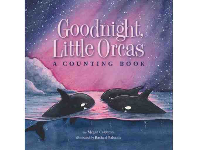 Enjoy a copy of "Good Night, Little Orcas" by Megan Calderon and an orca plushie.