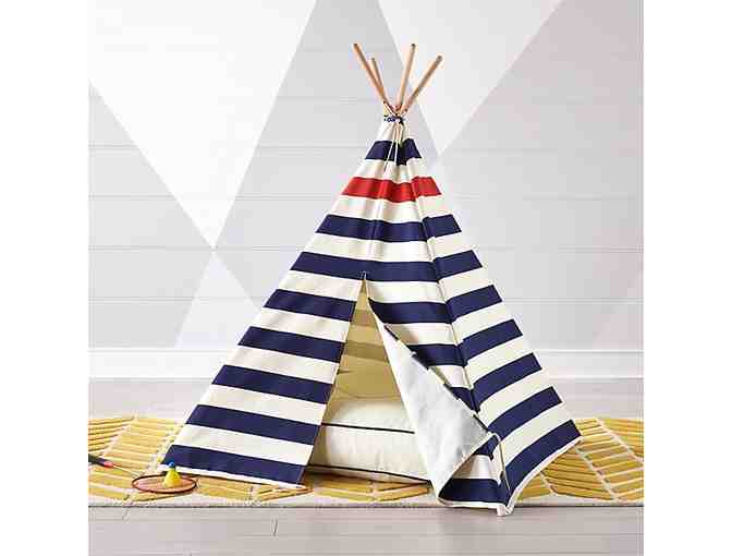 Crate & Barrel Teepee & Cushion Set: We've taken a teepee and given it a touch of seaside-style. Our Nautical Blue Stripe Teepee features blue and white stripes, with a single red stripe at the top for an added seafaring touch.