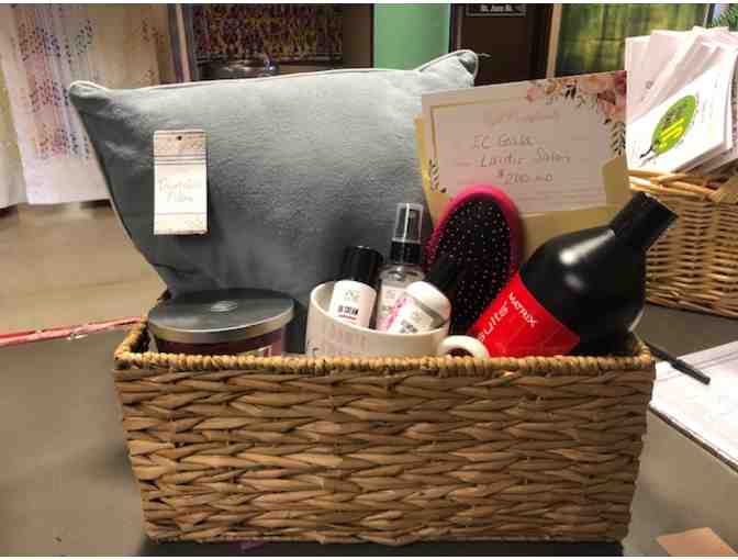 $200 Gift Card, pillow, candle, mug, matrix shampoo and conditioner