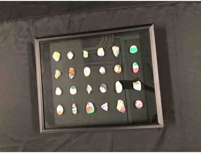 Beautiful rocks creatively painted by the kids in Anna's class, tastefully arranged in a shadowbox.
