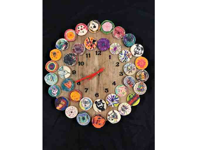 This tree clock is decorated with beautiful illustrations on wooden disks by the kids in Emily Fox's class.