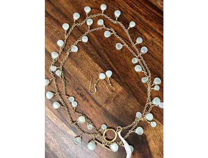 Aquamarines hand wired to 14 kt gold filled chain & clasp, with matching earrings. 35" long.