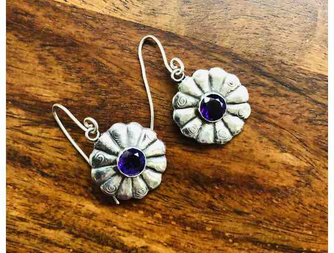 Natural amethysts set in sterling. Earrings made of metal clay .960 pure silver. 15/16" diam