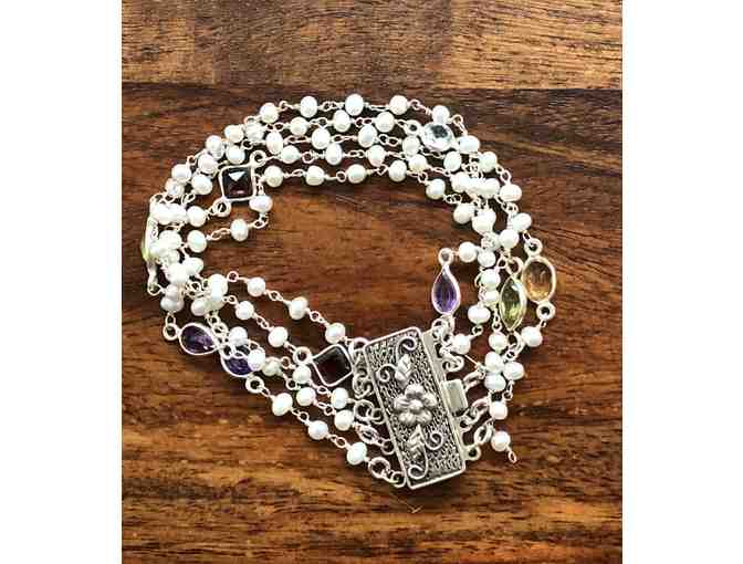5-strand pearl bracelet w/sterling links and clasp, set with gemstones. 7"