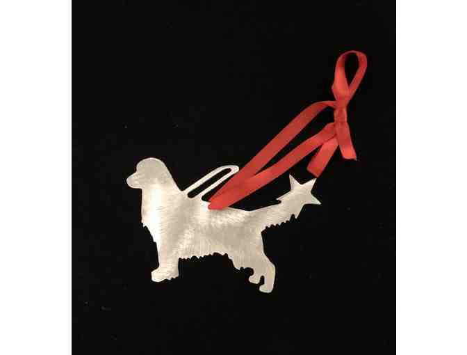 A shining star is born! This polished aluminum metal golden retriever is in a harness, ready for work. The dog profile tail to nose is 5½ inches wide and 3½ inches tall. Its tail features a shining star at the tip. There is a detachable red ribbon, making the ornament suitable for hanging on a Christmas tree or anywhere in your home.