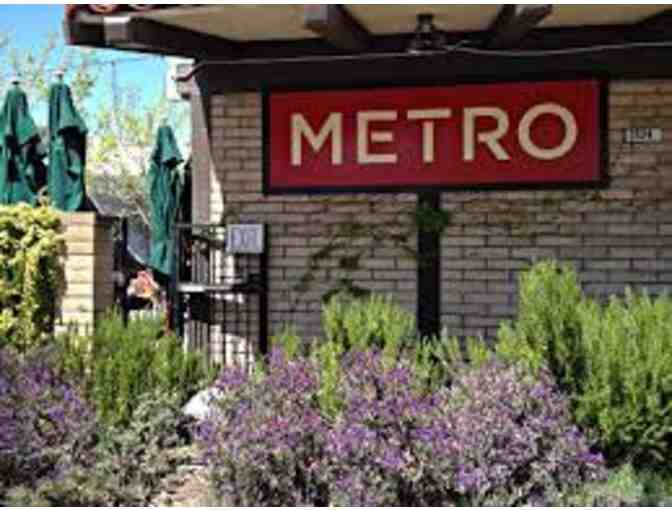 $50 gift card to Metro Lafayette! Merging urban sophistication with a relaxed suburban attitude, Metro is a stylish destination serving big city food. With the largest outdoor patio in the east bay, it's the perfect place for al fresco dining among mulberry trees, kitchen garden herbs, and trellised vines. Metro Lafayette is located at 3524 Mount Diablo Boulevard.