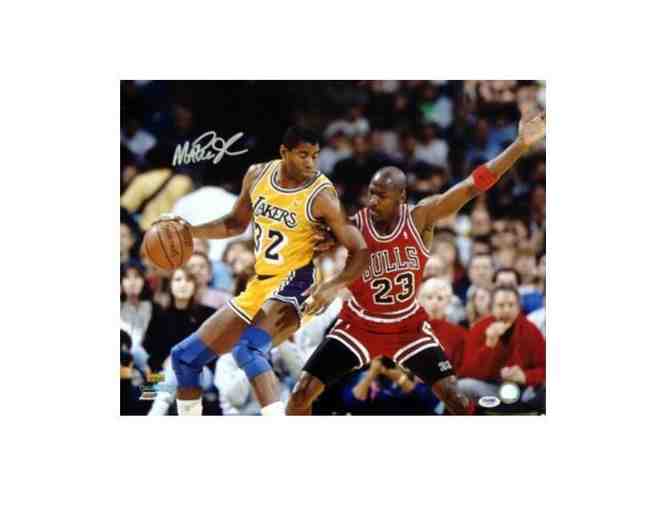 Two of the greatest to ever play the game going at one another on the post! This photograph is signed by Magic Johnson Only.