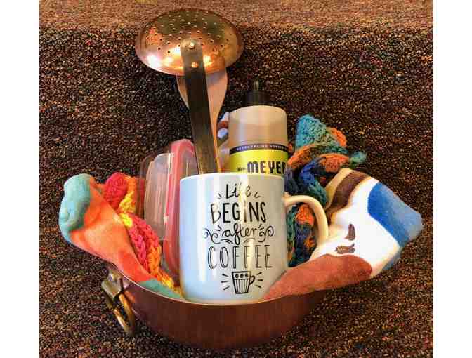 Add some flair to your kitchen with this copper bowl filled with kitchen accessories. Items included: handmade dish towels, Meyer's dish soap, coffee mug, glassworks storage container and a sweet creations wooden spoon and copper ladle.