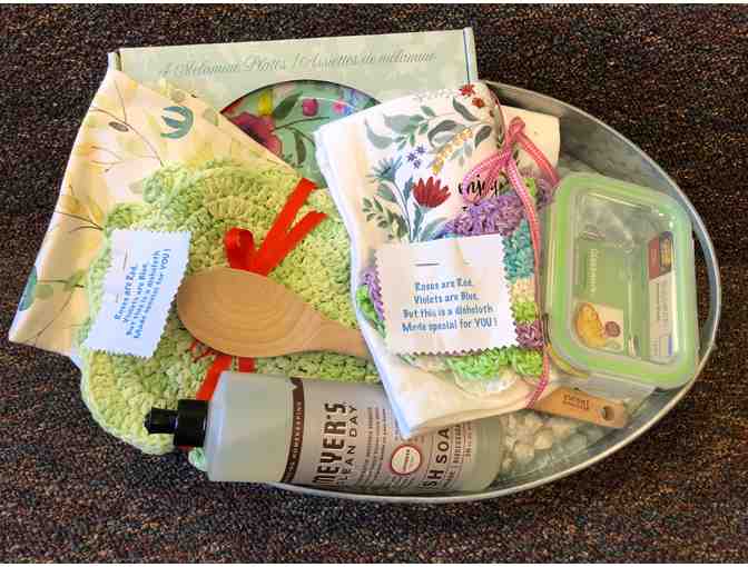 Dress up your kitchen and serve your guests in style with this collection of kitchen accessories. In addition to a metal tray, this gift includes two sets of handmade dish towels, Meyer's dish soap, set of four melamine floral plates, glassworks storage container and a sweet creations wooden spoon.