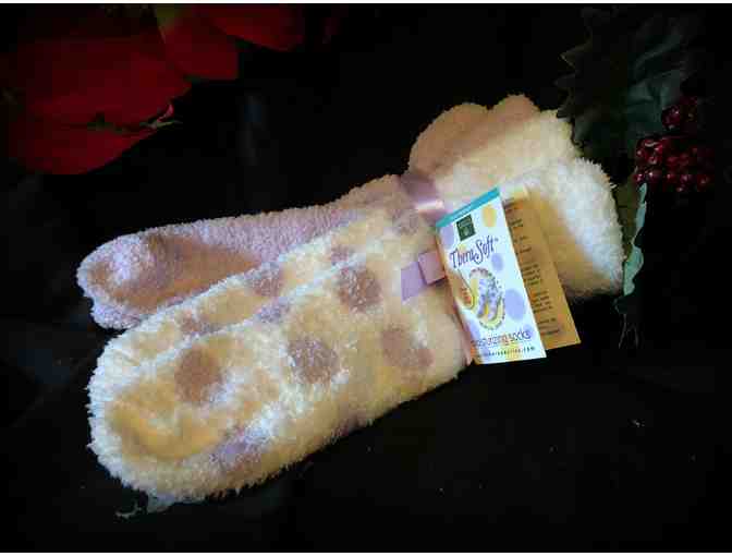 2 pair pack of chenille non-skid slipper socks with lavender infused, fuzzy and warm, for girls and women, 1 size fits all. Colors are a Pretty Lavender solid or Polka Dots