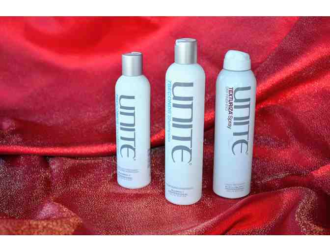 A certificate for a shampoo and blow dry, manicure, and pedicure from Rumors Salon in Scottsdale. The package also comes with bottles of Unite Texturizing Spray (7 oz.), Unite 7Seconds Shampoo (10 oz.), and Unite 7Seconds Conditioner (8 oz.).
