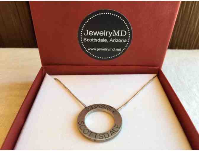 Stationary sterling silver BASIS circle pendant with the date engraved on backside with 2 tsavoriten on 17" sterling silver mini box chain, custom made by a BASIS parent.