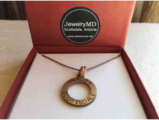Antique bronze BASIS circle pendant with the date engraved on backside with 2 tsavorite 2 rose gold plated ring bail pendant on 18" sterling silver oxidized mini box chain, custom made by a BASIS parent.