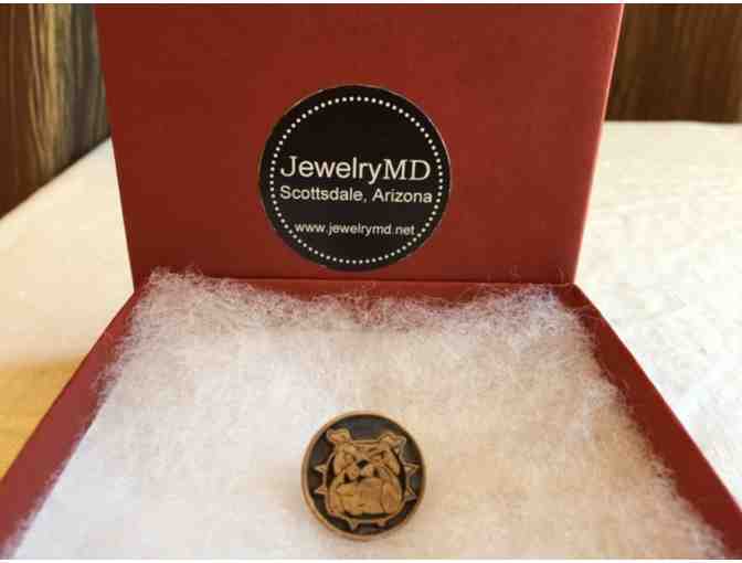 Antique bronze BASIS bulldog pin with the date engraved on the backside, custom made by a BASIS parent.