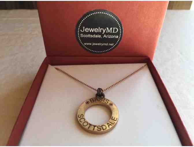 Antique bronze BASIS circle pendant with date engraved on backside on SS rose gold plate bead chain, custom made by a BASIS parent.