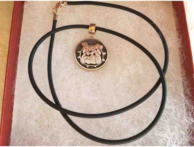 Antique bronze mini BASIS bulldog round pendant with date engraved on the back and tsavorite rolo bail on 16" black rubber cord, custom made by a BASIS parent.
