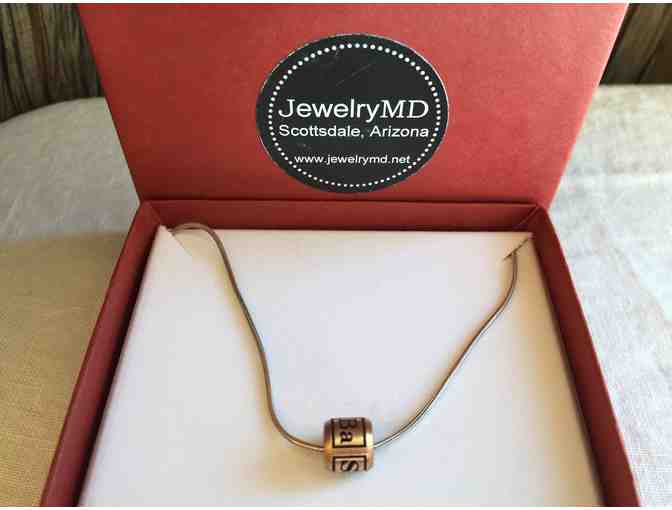Antique bronze small BASIS elements rolo with tsavorite on 16" sterling silver snake chain, custom made by a BASIS parent.