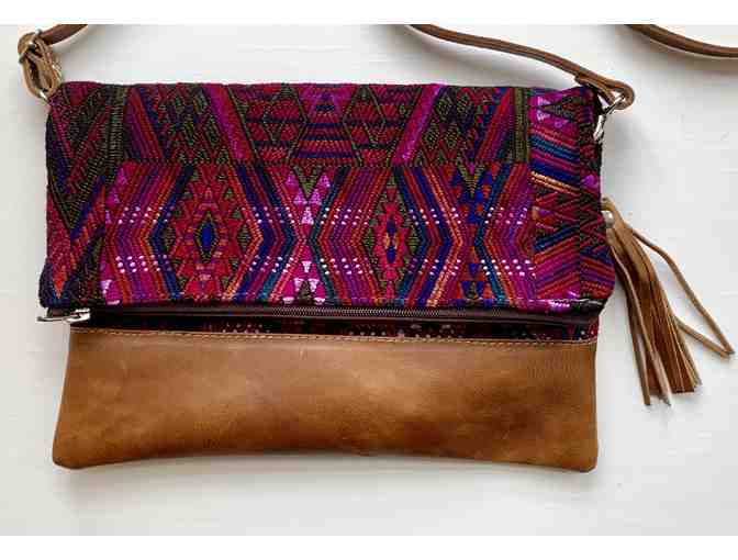 High quality leather Guatemala Clutch Purse with purple weaving with flap.