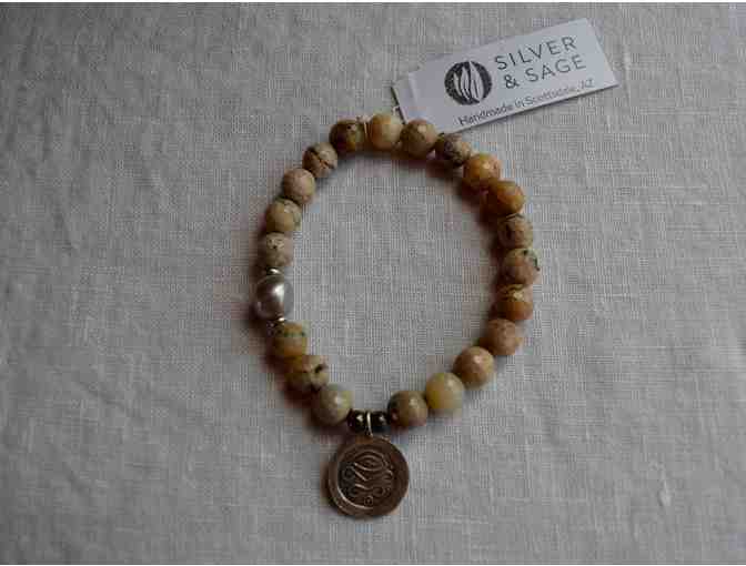 A faceted African opal, silver pearl & pyrite bracelet with hill tribe silver kundalini eye charm & silver-plated brass.