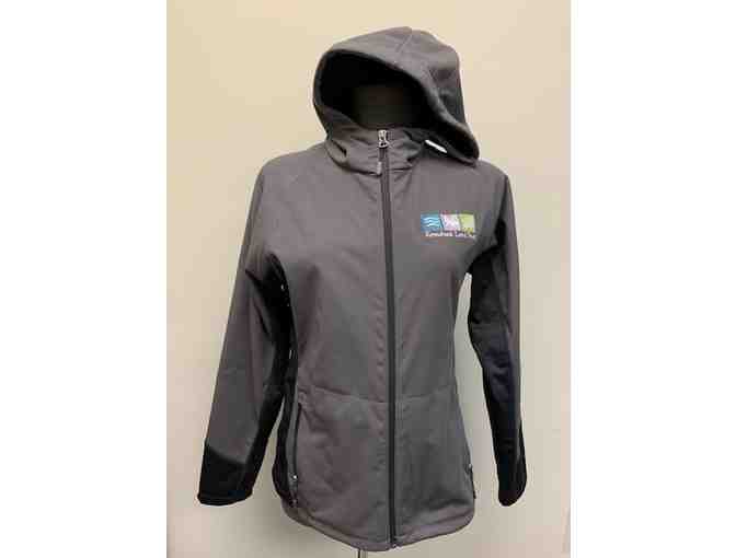 Women's medium, Nylon and fleece lined, Gray/black jacket. Size M. Embroidered with Kennebunk Land Trust logo.