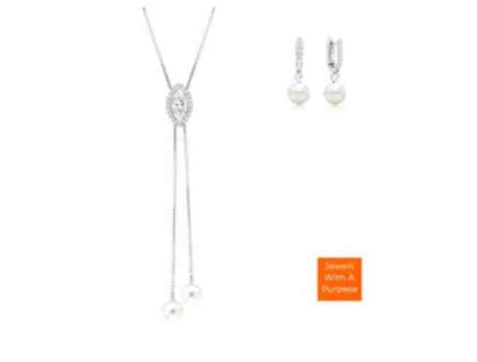 Sterling Silver sliding lariat necklace with zircon pendant and pearl tassel + pearl drop earrings with lever back closure.
