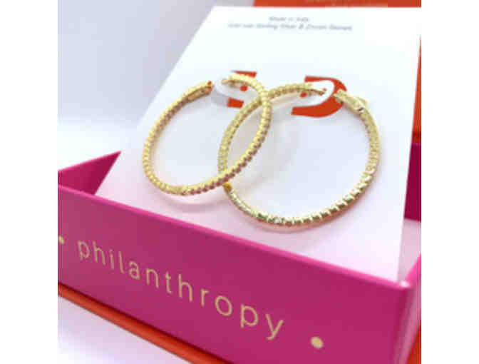 Sterling Silver with 18K Gold finish Pave’ hoop earrings with CZ stones inside and outside and safety clasp.