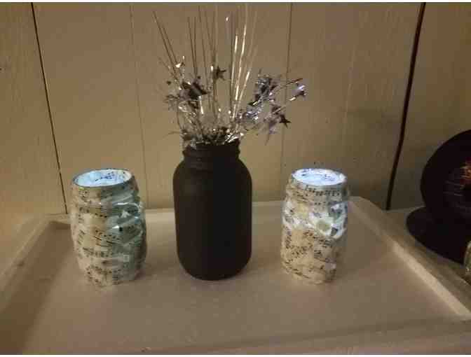 This features a Quart Mason jar painted with Chalk paint so that you can customize it and is perfect for a fresh batch of flowers. Along side it are 2 Pint Mason Jars covered in music and hold 2 battery operated candles.