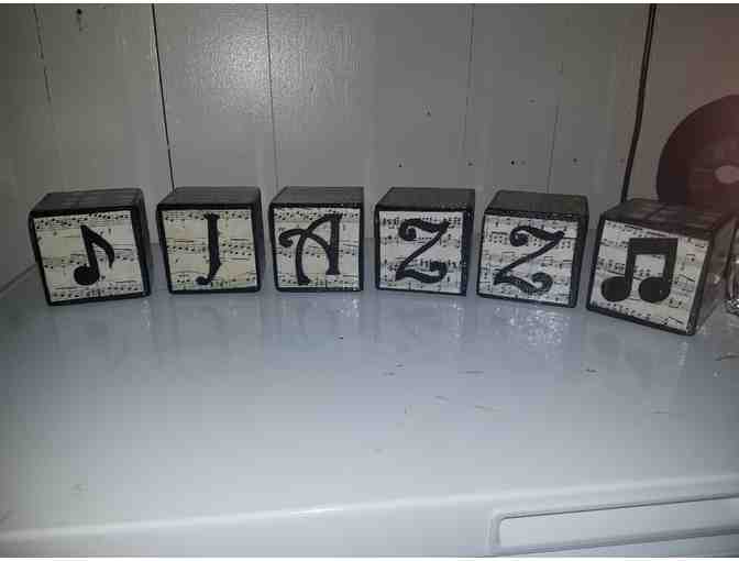 This features 6 2.5x2.5 (approx.) handmade Blocks that spell out JAZZ on both sides and decorated with music behind.