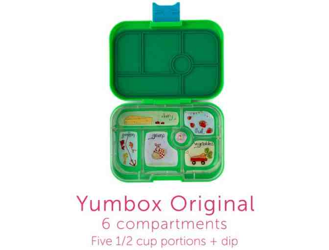 A pre-portioned 6-compartment Yumbox. All food safe materials; BPA-free and phthalates-free.