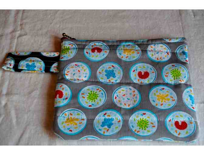 A 6" X 7.5" gray petri dish wristlet pouch with metal zipper, handmade by Mrs. Yanashima.