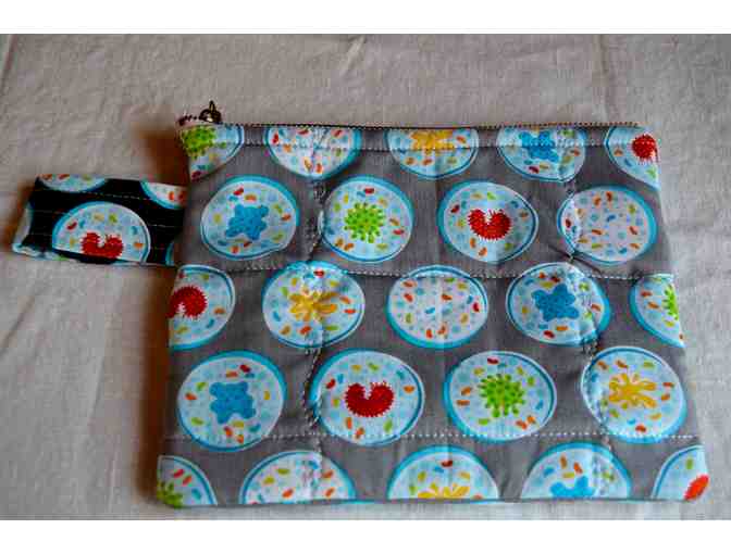 A 6" x 7.5" gray petri dish pattern pencil pouch with carrying loop, decorative leaf stitching, and a metal zipper.