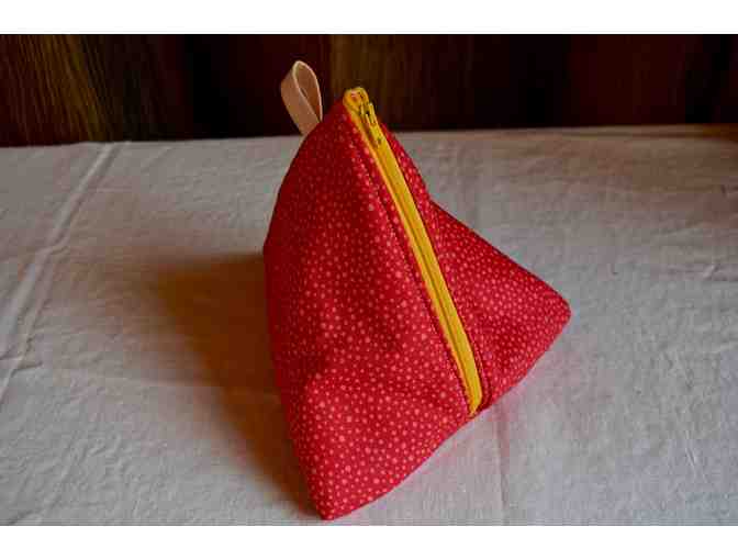A 7" pyramidal pouch in red dot fabric with yellow zipper, handmade by Mrs. Yanashima.