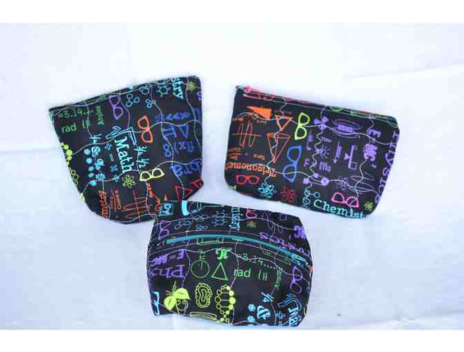 Set of three matching hand-sewn multicolor chemistry doodle pencil pouches (one 6.5 x 9.5", one 8.5 x 8", one 8 x 9"), designed by Ms. Yanashima.