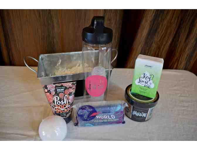 All the fixings for a relaxing day of beauty: Perfectly Posh infusion water bottle; one bathbomb; Key Lime Pie 7 oz. bath bar; Out of This World 6 oz. dual sided bath bar; Amaaazing fresh mint and wild honey 10 oz. jar of body butter' and Posh Boss creamy vanilla, sweet cassis, and peony 3 oz. hand creams.