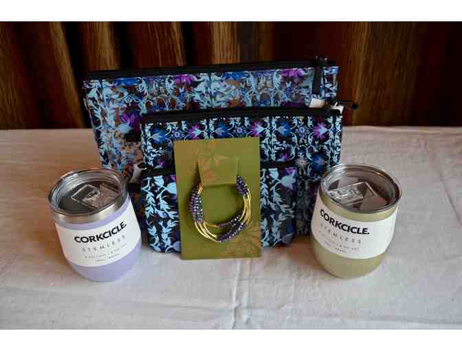 Update your Spring wardrobe with these additions from Gift-ology: Scout wrap bracelet in amethyst / gold, Vera Bradley travel pouch set, Corksicle stemless insulated wine glass in purple shimmer, and Corksicle stemless insulated wine glass in gold shimmer.