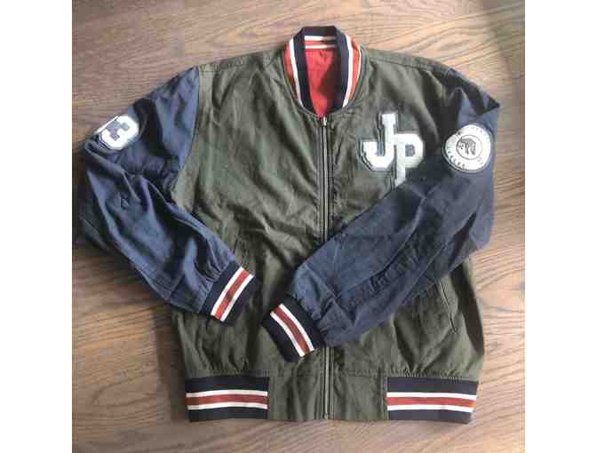 • One vintage-style cotton canvas reversible collegiate bomber jacket (Army Green/Rust Orange)- size Adult Large
