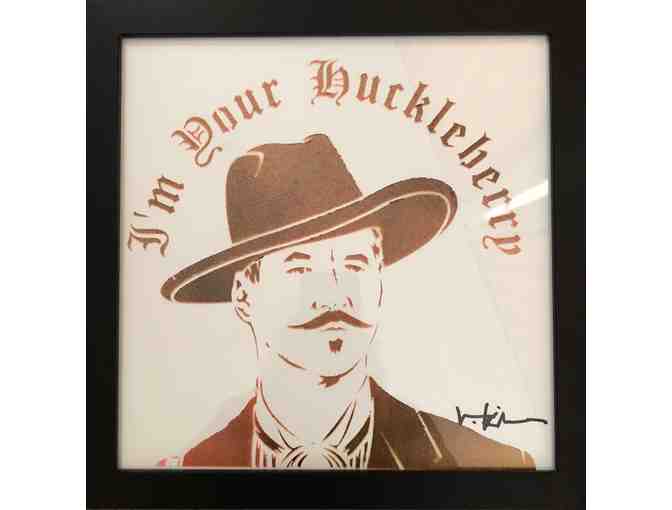 This original Doc Holliday Stencil Artwork by Val Kilmer is a 12" x 12" print on paper signed by the artist and placed in a frame with glass overlay. The words, "I'm Your Huckleberry" come from the movie Tombstone where Val's character makes that famous statement.