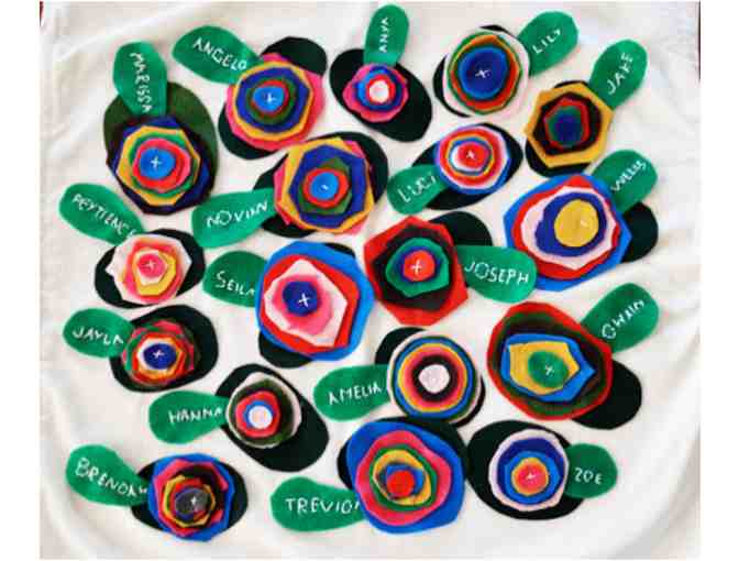 Each student made a flower of felt circles starting with the littlest circle and ending with the biggest. Each flower ended up being special and beautiful, just like the students in the class! The flowers were sewn on a pillow cover to make a soft and cozy garden of little flowers.
