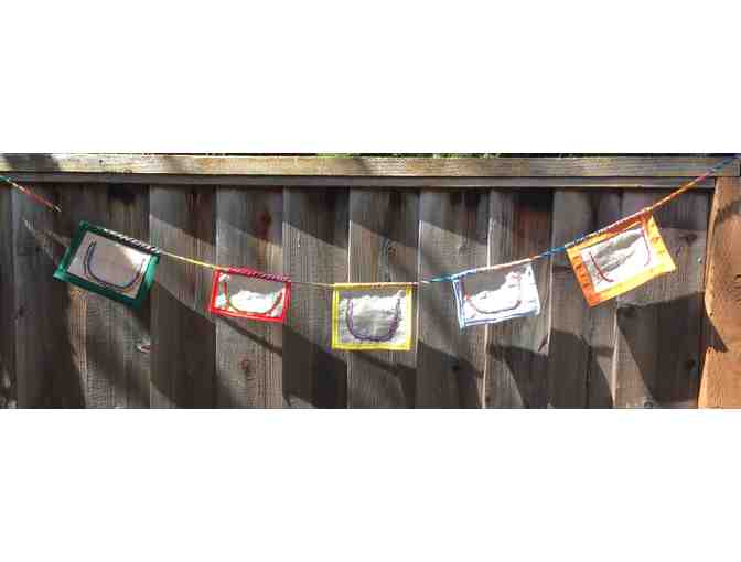 The swatches have been kept just as they were made by the students. We have added felt backing and cloth boardering. They will add color and a festive mood to any celebration.
