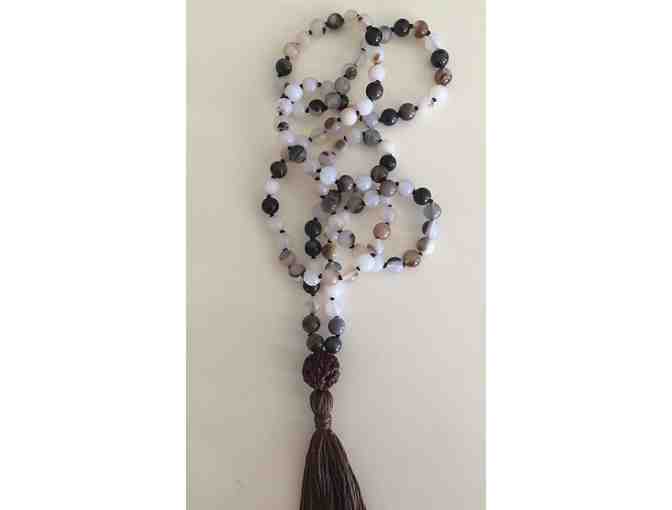 This elegant, one-of-a-kind 108 Japa MÄlÄ is made with 8mm Natural Agate beads hand-knotted with brown thread and finished with a Babaji Guru bead and handmade brown tassel.